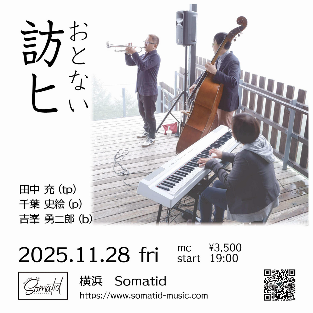 訪ヒ(trio)@関内ソマチッド SCHEDULE 2025/11/28(金) 19:00 - 田中充(tp)、千葉史絵(p)、吉峯勇次郎(b) 関内ソマチッドhttps://www.somatid-music.com/ URLをコピーする 報告する